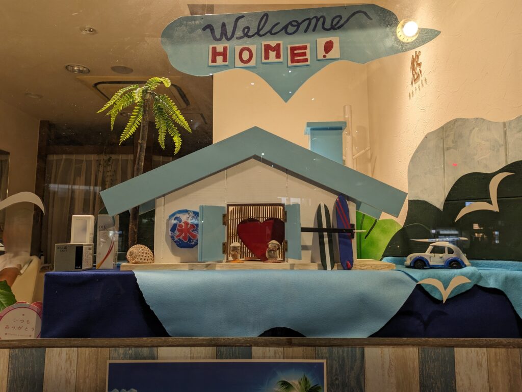 2025年1月1日 / 最終更新日時 : 2025年9月7日 iyashi0508 ~悠~のディスプレイ 夏 ~悠~のディスプレイ2025年夏 2025年夏、~悠~のディスプレイは今までのパターンと少し変わります。 テーマは「Welcome HOME」です。 上部。可愛いお家をベースに秋、冬、春、初夏の雰囲気を出していきます。 下部。 可愛いお家はもちろん、ディスプレイ担当者の手づくりです。 我が家のようにくつろげる場所。「Welcome HOME」おかえりなさい。ご来店されるお客様への~悠~からの気持ちがテーマになりました。 上部、左側。夏の雰囲気が出てますね! 上部、中央。ハートもディスプレイ担当者の手づくりです。材料は木。丸みをつけるのは凄くたいへんだったと思います。2024年夏に登場した貝細工の生徒さんもいます。 上部、右側。サーフボードもディスプレイ担当者手づくりです。 フィンもちゃんとありますよ。 2013年夏から夏になると度々登場するオブジェ。今年も登場しました。2014年夏、2017年夏、2024年夏、にも登場してます。